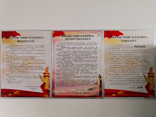 近日,郑州市房地产市场和产权交易管理中心结合驻市房管局纪检监察组的监察建议,开展“制作‘三书’晒上墙,践诺履责受监督”活动。在各科室负责人办公室悬挂《行风建设承诺书》、《落实全面从严治党目标责任书》、《廉政风险警示告知书》三块展板,并由各科室负责人在前两块展板上签字承诺。《廉政风险警示告知书》则在每间办公室都进行悬挂,针对工作人员依法履职、廉洁从政从业等方面明确提出“十条禁令”,警示每名人员不违规办件、不吃拿卡要、不故意刁难、不滥用职权,时时警钟长鸣,处处加强防范,打好廉洁从政从业预防针,并自觉接受社会和群众的监督。