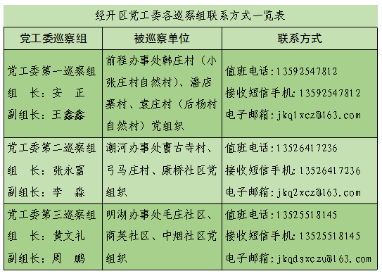 巡察期间,党工委各巡察组均开通联系电话、电子邮箱,并在被巡察村(社区)设置联系信箱。(经开区纪工委)