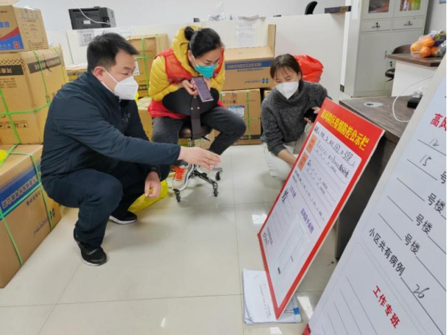 (图为郑永浩与社区工作人员研判疫情防控工作)
