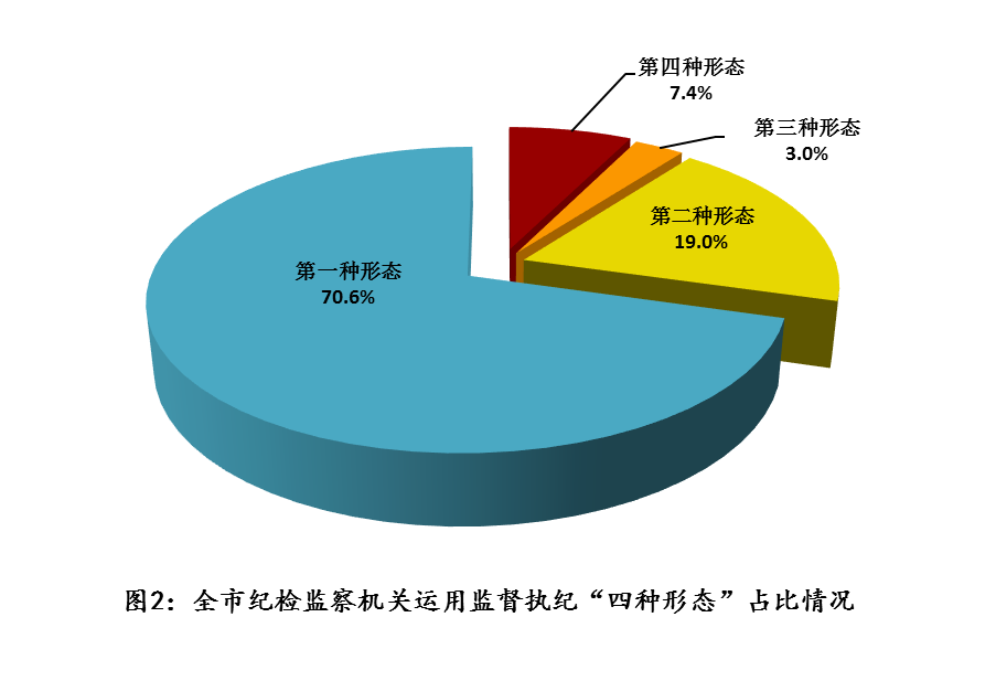 2019年上半年,全市纪检监察机关运用监督执纪“四种形态”处理3870人次。其中,第一种形态2731人次,占“四种形态”处理总人次的70.6%;第二种形态736人次,占19%;第三种形态116人次,占3%;第四种形态287人次,占7.4%。