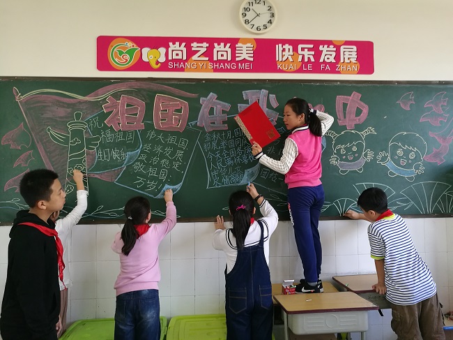 孩子们在教室精心绘制黑板报,他们积极分工合作,齐心协力发挥各自专长,一笔一划都饱含着对伟大母亲的热爱之情。