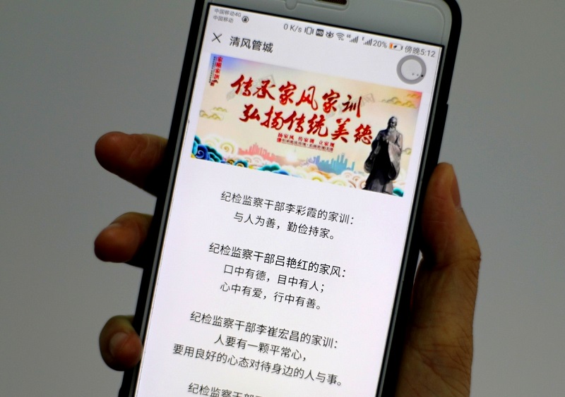 设置“微平台”。在全区纪检监察系统开展“培树家风家训”活动,征集优良家风家训,并通过微信工作群、微博、微信公众号等平台推送具有典型性、独特性、传承性的家风家训,营造浓厚氛围,确保家风建设“时时在线”。