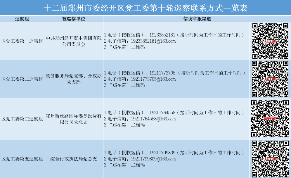 巡察期间,区党工委巡察组开通专门接收来电(短信)手机、电子邮箱,也可通过扫描“郑在巡”二维码举报平台反映问题,主要受理反映被巡察党组织主要负责人、班子成员和重要岗位党员干部是否存在违反政治纪律、组织纪律、廉洁纪律、群众纪律、工作纪律和生活纪律等方面问题的来信、来电,其他不属于巡察受理范围的信访问题,将按规定转交有关部门认真处理。巡察受理信访时间截至到2025年11月24日(工作日上午8:30-12:00,下午14:00-17:30),巡察结束后,所有举报反映方式全部关闭。(按照省市集中督查工作要求,区党工委第四巡察组开展集中督查工作,不开通信访渠道。)
