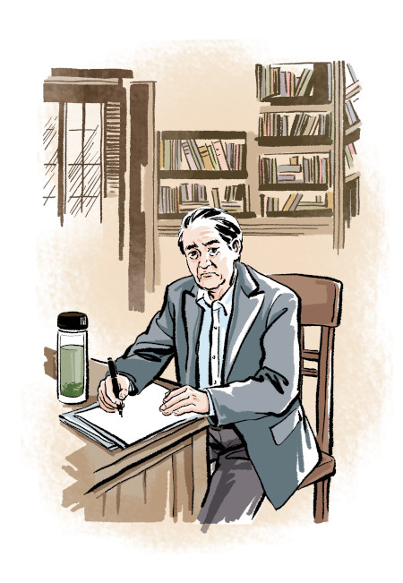 突然,老耿从怀中掏出“铁笔头”,两手紧握,“咔嚓!”一声,愤然断笔。老耿双臂抡起,双手猛摔,两截断笔如箭飞出。前半截笔尖深插桌面,入木三分;后半截墨汁喷溅,洇黑了书桌上所有的稿件。