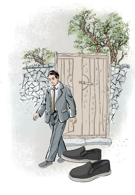 有一天,他发觉自己得了脚气,摄魂蚀骨,奇痒难忍,百法用尽,不见好转。忽一日,听说老家的千层底布鞋可治脚气,就驱车从省城赶回老家。在经过当年上学的学校门口时,他心血来潮又从学校门口走到了家门口,这一走他大吃一惊,怎么不对了?九十五岁的老母亲,正搬着小凳子坐在门口,他像孩子似的伏在老母亲的膝盖上。