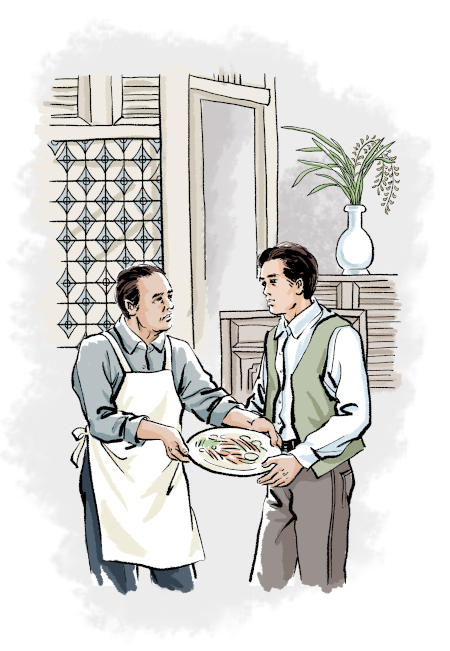 袁海被震撼了,他想不到袁家菜如此博大精深,对眼前这位袁家菜的掌门人顿生敬慕之情,他恭恭敬敬倒了一杯酒双手捧给父亲。父亲接过酒放下,也倒了一杯酒双手端给袁海:“从今天起,你要认识袁家菜,学会做袁家菜,还要把袁家菜传承下去。”