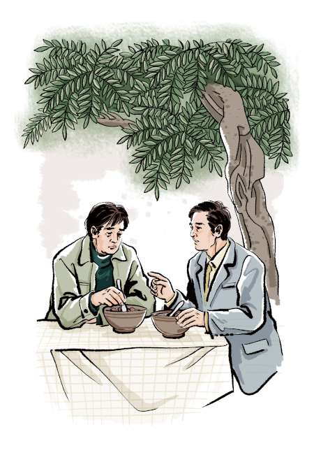 一碗汤喝了俩钟头,喝得街头人流散尽。跑堂的闲得刷起了手机,不时从一篷亮光里抬起头,看看槐树下这小方桌边,默默无语的两个男人。