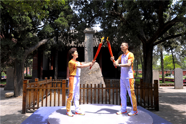 第一棒火炬手施一公与第二棒火炬手海霞进行火炬交接(王晓慧 摄)