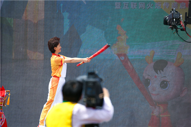 海霞与虚拟火炬手吉祥物“中中”进行火炬传递完成现实和虚拟的转换(付文龙 摄)