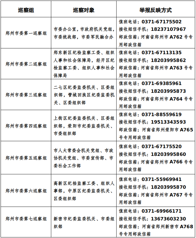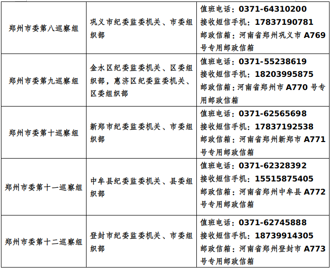 十二届郑州市委第八轮巡察各巡察组联系方式一览表