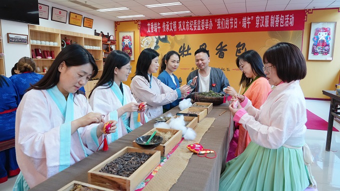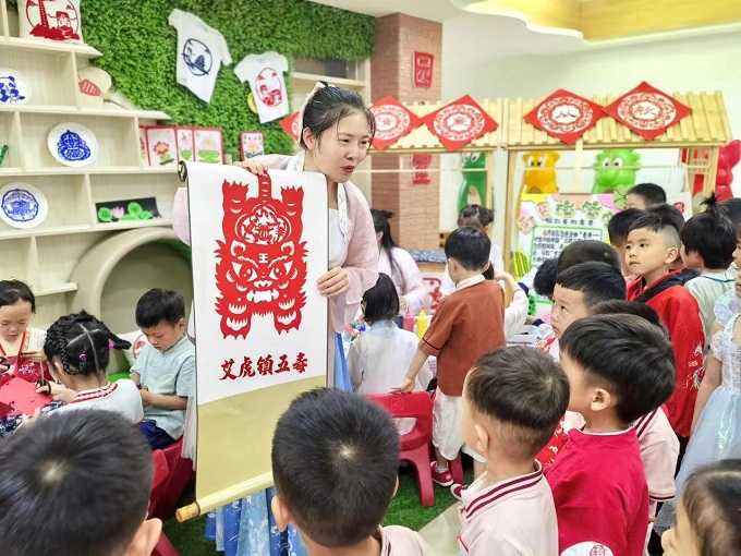 在端午节到来之际,开封市龙亭区新街口幼儿园老师在实践课堂上与孩子们一起包粽子、插艾草、编彩绳、剪艾虎,感受传统文化的魅力。(开封市龙亭区纪委监委 刘迪 摄)