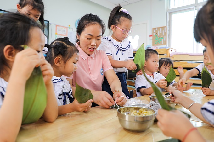 兰考县第七幼儿园老师在课堂上带领孩子们学习包粽子,既锻炼孩子们的动手能力,又体会到中华传统节日的魅力,增强了民族自豪感。(兰考县纪委监委 刘涵 摄)