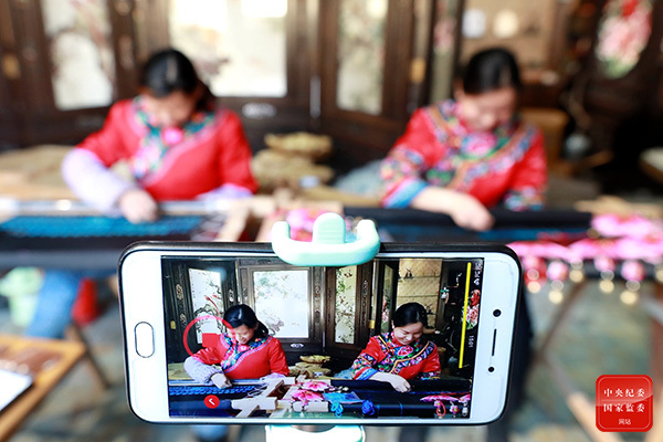 重庆市酉阳土家族苗族自治县苗绣扶贫车间积极应对疫情带来的冲击,改过去的展销为“网销”,开设网店,利用抖音视频、直播等形式宣传产品,苗绣产品销量成倍上升。(重庆市酉阳土家族苗族自治县纪委监委供 杨春来 摄)