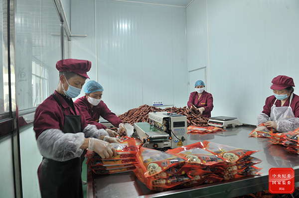 湖北省恩施土家族苗族自治州宣恩县椒园生态产业园内,自从晓明食品公司的农产品上线扶贫平台以来,手工香肠供不应求。在生产车间里,工人们正加紧赶制,确保销往浙江、武汉等地的订单顺利发出。(湖北省恩施土家族苗族自治州宣恩县纪委监委供 梁国熠 摄)