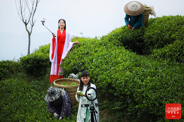 贵州省遵义市余庆县采取“媒体+农村电商+直播”的模式,拓宽销售渠道,将卖场搬到茶叶生产基地。身着古装的带货主播向消费者直观地展示采茶、制茶、泡茶全过程,通过电商扶贫实现“黔货出山”,助力实现贫困户致富。(贵州省遵义市余庆县纪委监委供 刘续 摄)