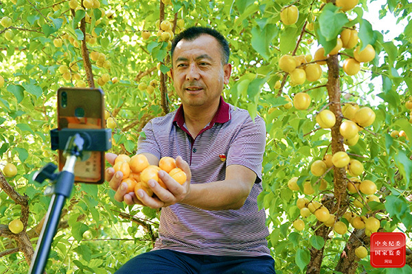五月下旬,新疆维吾尔自治区吐鲁番市高昌区英萨村百亩杏园的杏子成熟,市纪委监委驻村第一书记买合木提·肉孜利用本村小有名气的“巴依果”电商平台在网上进行带货。(新疆维吾尔自治区吐鲁番市纪委监委供 张甫军 摄)