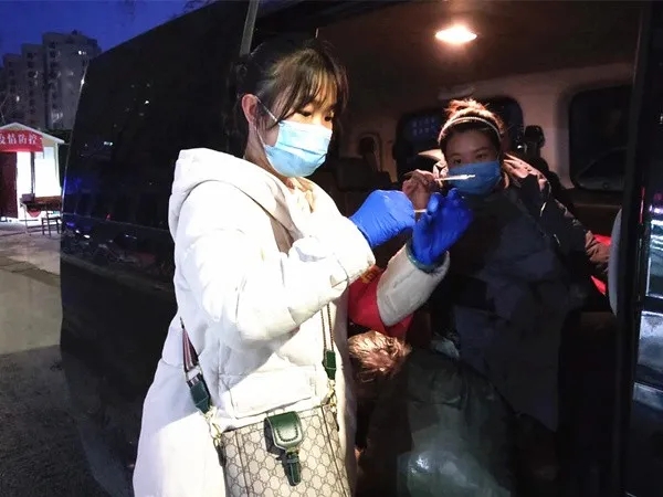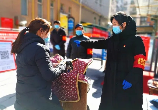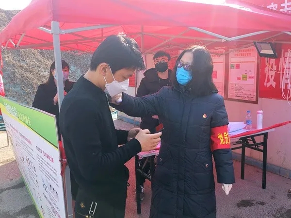 区委第一巡察组副组长白贺丽在为进出小杜庄村怡丰新都汇小区居民测量体温。