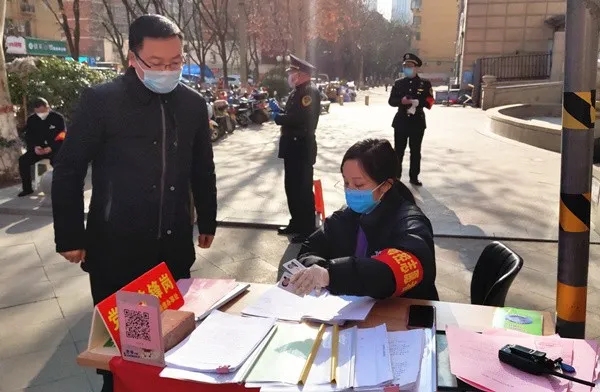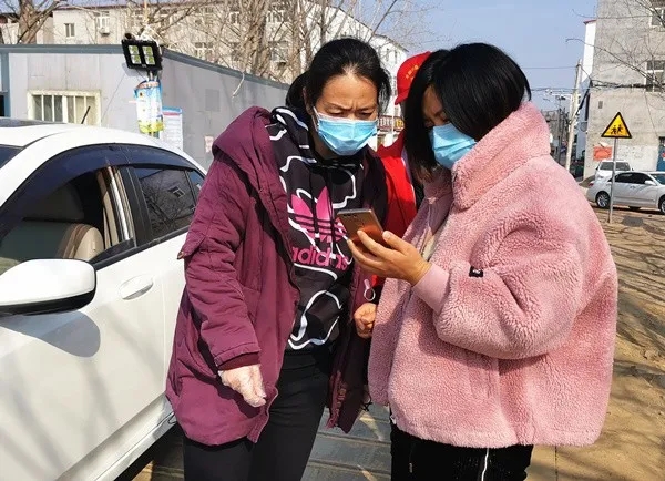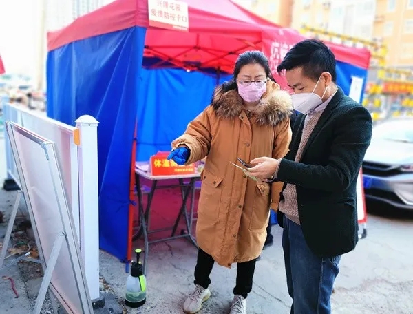 驻区检察院纪检监察组组长刘敏在兴隆铺路4号院卡点,通过扫描二维码登记小区居民个人健康信息。