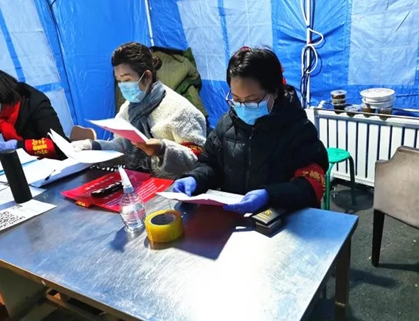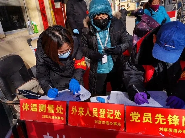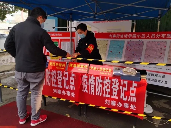 驻区委组织部纪检监察组组长孙丽在清华园社区卡点,为来往群众登记个人健康信息。