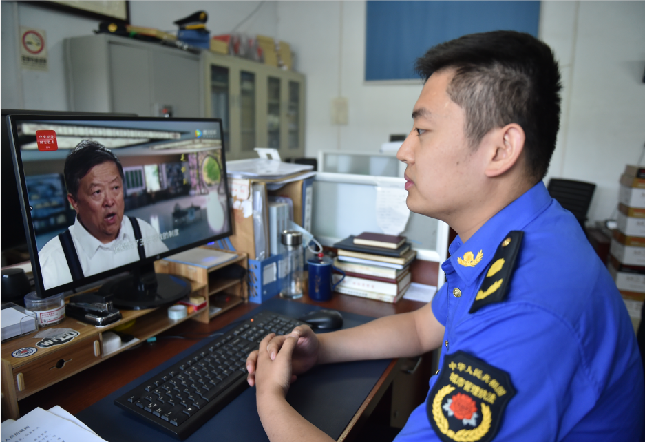 金水区执法局工作人员认真观看《据典话廉》系列微视频。(金水区执法局 黄宁娅供)