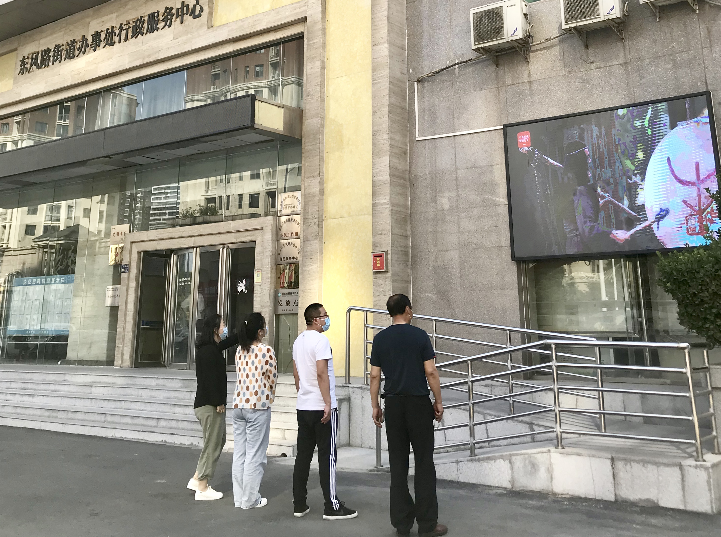 东风路街道办事处行政服务中心外墙的显示屏正在播放《据典话廉》系列微视频,前来办事的群众驻足观看。(东风路街道纪工委 李思迪供)
