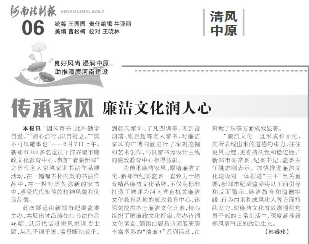 为贯彻落实党的二十大精神,弘扬传统廉洁文化,学习好家训,传承好家风,助推清廉新郑建设,2月7日,市纪委监委举办了“清廉新郑”之历代名人家风家训书法作品展。此次展览成效显著,工作方式方法被《河南法制报》采用报道,现予以全文转发。