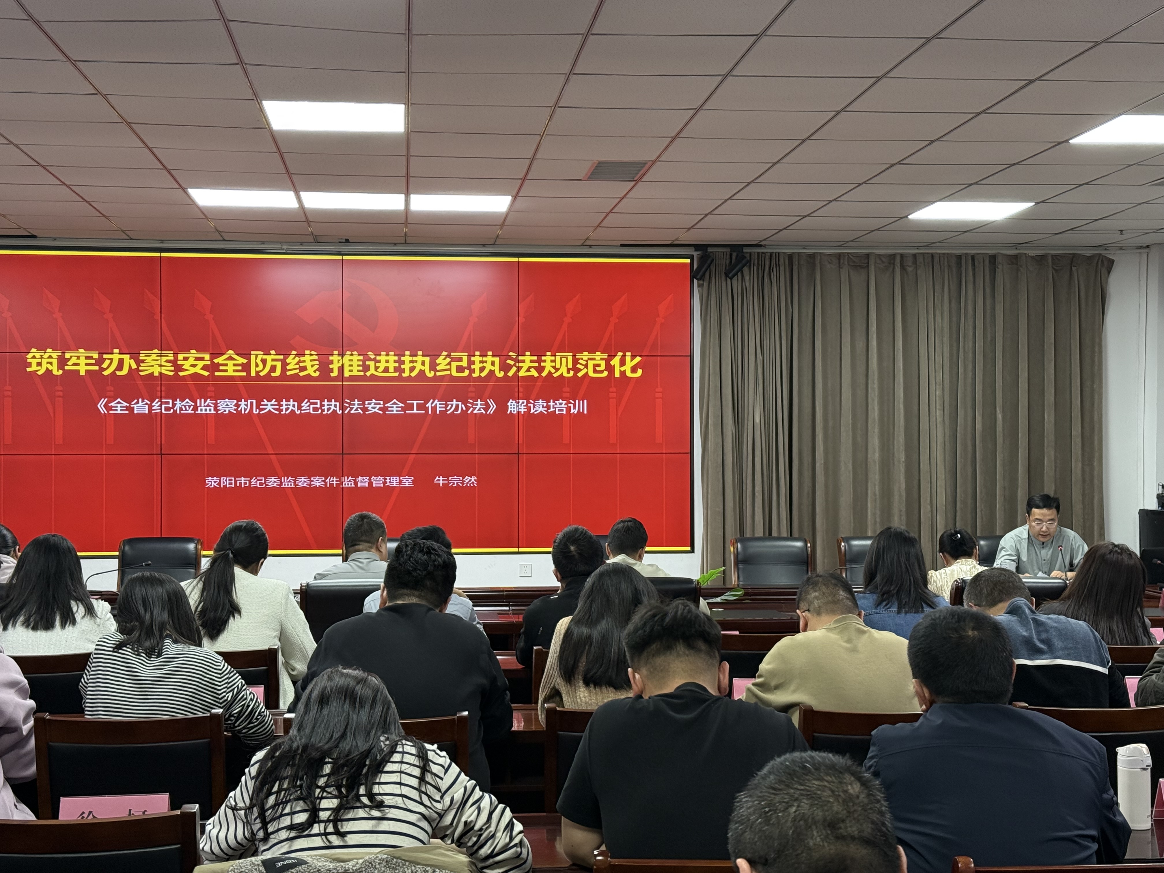本次培训由市纪委监委案管室牛宗然授课。授课中,牛宗然从《全省纪检监察机关执纪执法安全工作办法》制定背景切入,系统梳理办法中的新规定、新要求,对重要条款进行详细解读,并结合案件办理工作实践,归纳总结关键节点与易忽视环节,提醒各部门严格执行办案安全流程,层层压实责任链条,确保审查调查措施使用合规、审慎,共同推进办案安全工作。