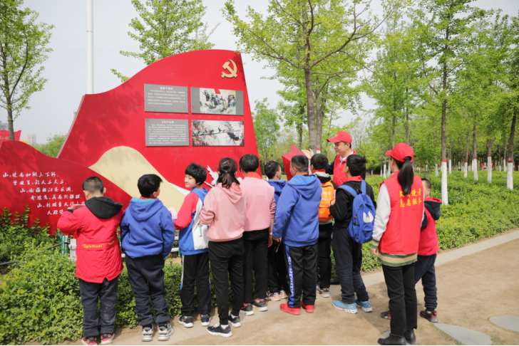在重走长征路主题长廊,为游园的学生们宣讲战斗英雄的光辉事迹,激发青少年的爱国热情。