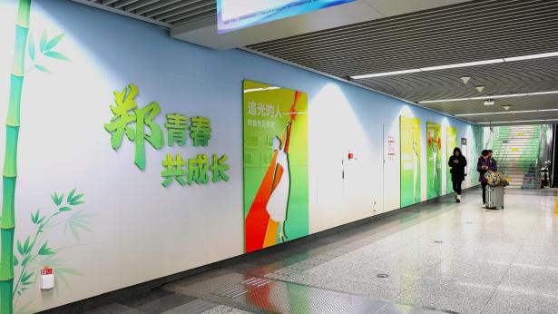图为“郑青春”打卡墙,围绕“有理想、敢担当、能吃苦、肯奋斗”四个主题设计,生动展现青年与城市共奋进、同成长的活力画卷。