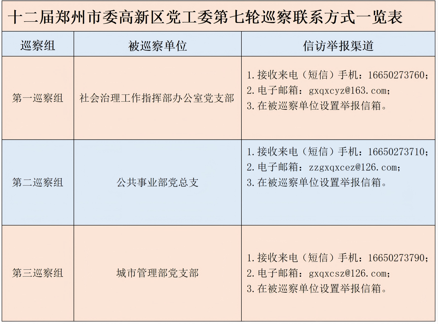 根据郑州高新区党工委巡察工作部署,截至3月9日,十二届郑州市委高新区党工委第七轮巡察完成进驻工作。本轮巡察共派出3个巡察组,对社会治理工作指挥部办公室党支部开展常规巡察暨集中整治群众身边不正之风和腐败问题专项巡察,对公共事业部党总支、城市管理部党支部开展巡察“回头看”。现场巡察期为2个月,巡察期间开通接收来电(短信)手机、电子邮箱、举报信箱、“郑在巡”二维码举报平台,主要受理被巡察单位党组织领导班子及其成员和下一级主要负责人和重点岗位人员问题的来信来电来访,重点是关于违反政治纪律、组织纪律、廉洁纪律、群众纪律、工作纪律、生活纪律等方面问题及涉及群众身边不正之风和腐败问题的来信来电来访。对于不属于巡察受理范围的信访问题,按规定转交有关部门处理。巡察受理信访时间截至2026年4月23日。