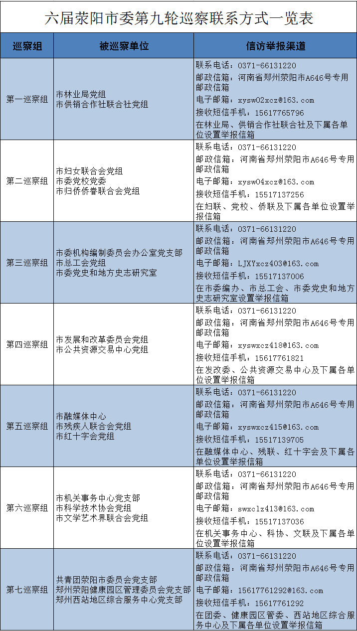 按照市委统一部署,六届荥阳市委第九轮7个巡察组于近日全部进驻,对市委机构编制委员会办公室、市总工会、共青团荥阳市委员会、市妇女联合会、郑州荥阳健康园区管理委员会、市委党校、市委党史和地方史志研究室、市机关事务中心、市融媒体中心、市残疾人联合会、市科学技术协会、市文学艺术界联合会、市归侨侨眷联合会、市红十字会、郑州西站地区综合服务中心15家单位党组织开展常规巡察,对市发展和改革委员会、市林业局、市供销合作社联合社、市公共资源交易中心4家单位党组织开展巡察“回头看”,现场巡察期至12月13日。